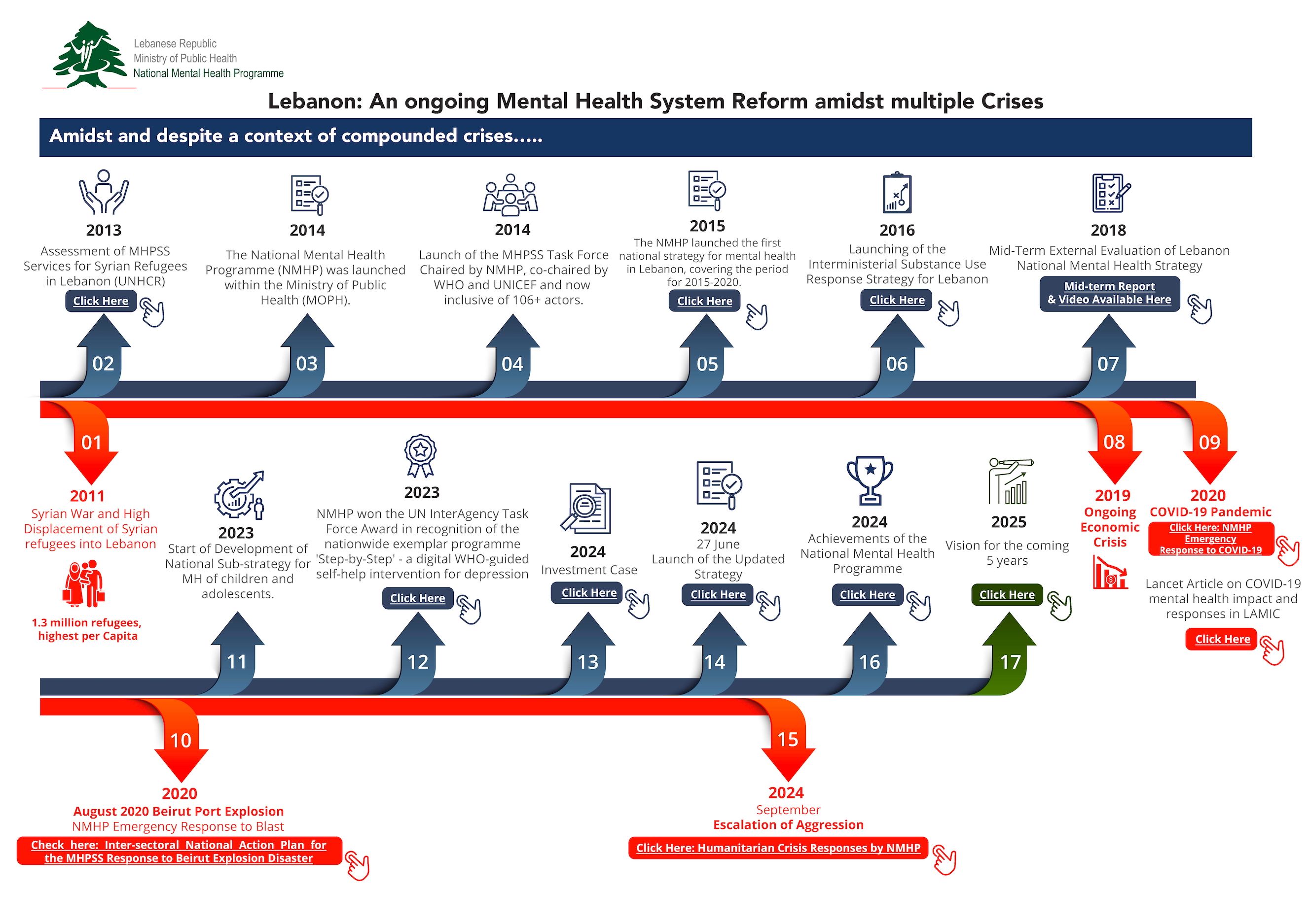 The National Mental Health Programme Timeline outlines how the NMHP has been reforming the mental health system amidst multiple compounded crises. It covers the years from 2013 to 2024 and lays out both the major milestones (in blue) and the emergencies it responded to (in red) while shedding light on how this is being done. Our objective is to support recovery while continuing to build a more resilient and multi-leveled system able to respond to any future crisis.